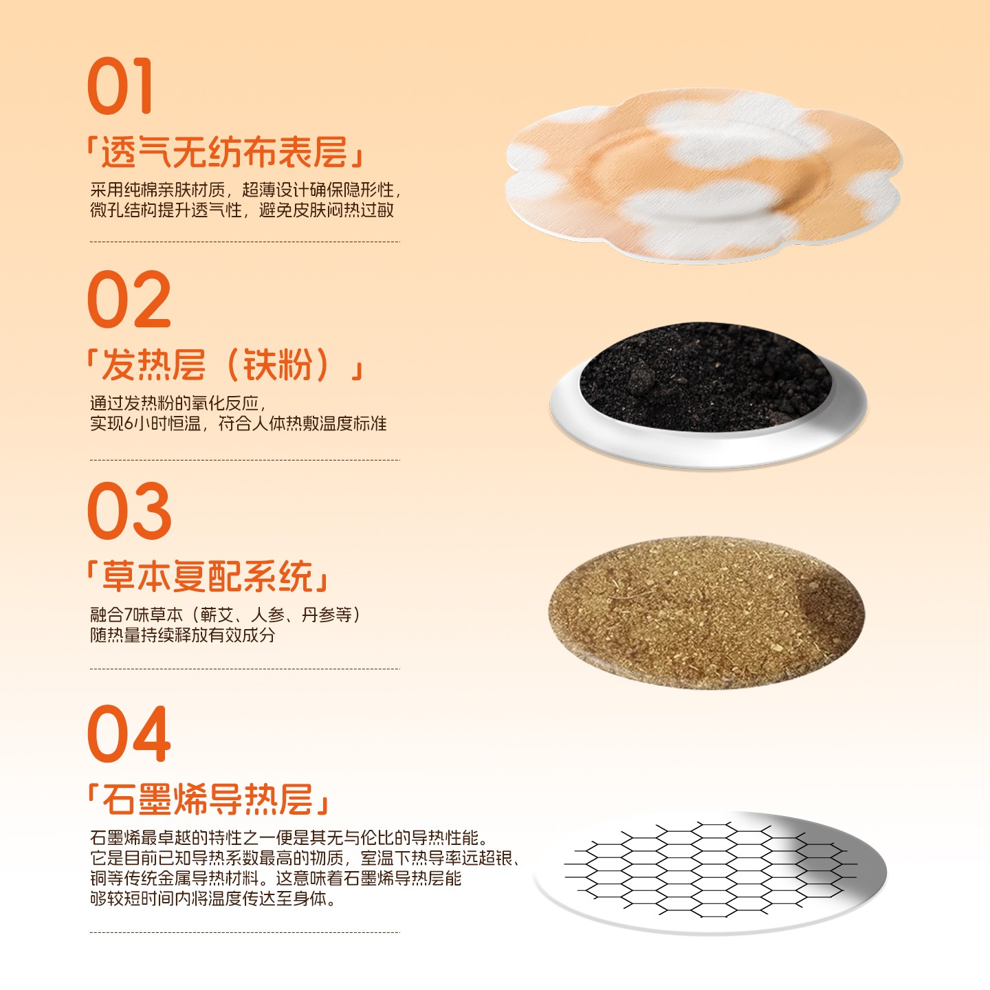 【智能控温,暖得“刚刚好”】 温度稳定在55℃以下,温暖持久6小时,告别传统暖宝宝忽冷忽烫的尴尬。 【7味本草,由内而外暖养】 甄选蕲艾、丹参祛寒除湿;干姜、肉桂温经散痛; 更融入人参、玫瑰与红花,补气润颜、活血焕彩。 在热量激发下,有效成分缓缓释放,真正实现“温经散寒、活血养颜”。 【高颜值花瓣形,遇见即治愈】 独特花瓣设计,完美贴合曲线。上班、约会、出差,随时随地,给你“贴”身的守护。