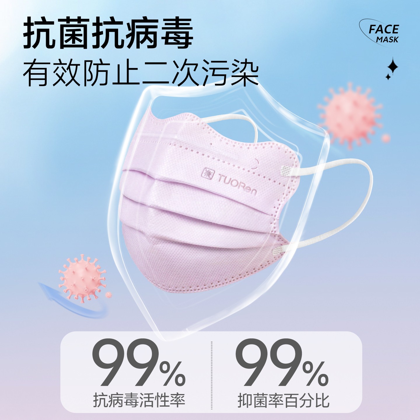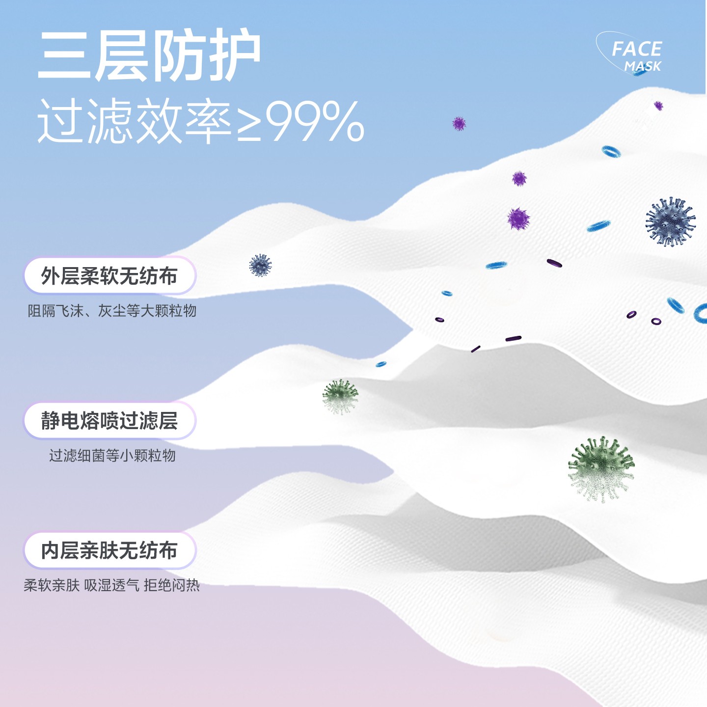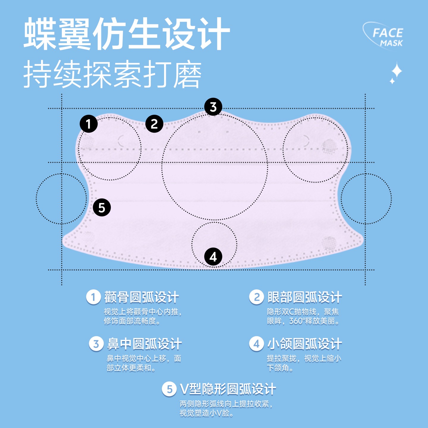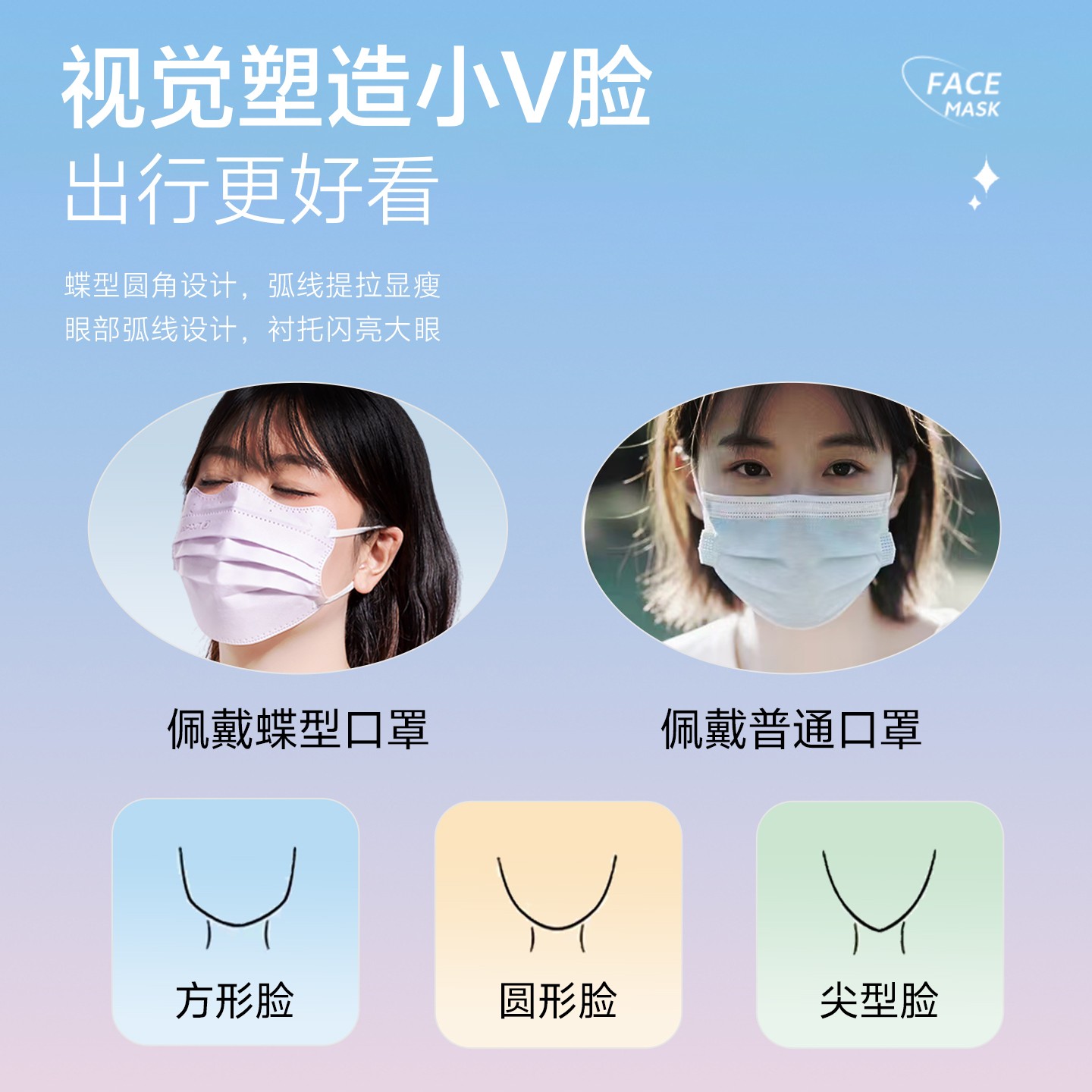 新升级M形设计更加贴合面部曲线, 不易蹭口红,修饰脸型,拍照更上镜。 采用高透气无纺布,呼吸阻力小于国家标准; 季铵盐抗菌技术有效消除异味和病毒,适合夏季或长时间佩戴。 加宽5mm耳带设计,久带不勒;升级版型设计优化,专攻视觉显瘦; 超声波精准焊点,耳带不轻易脱落,能够承受20N的重力。 单只独立包装,出行约会方便携带,更加干净卫生。