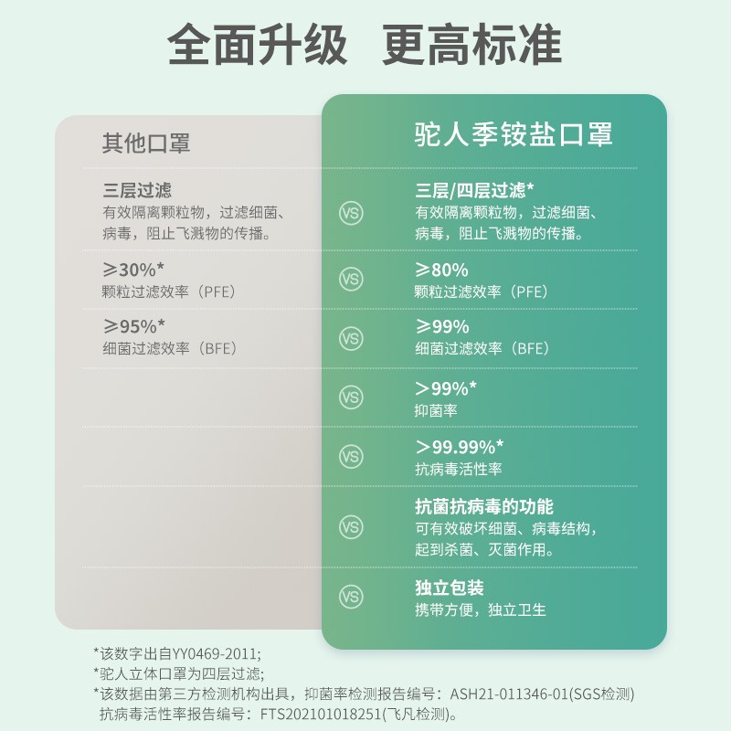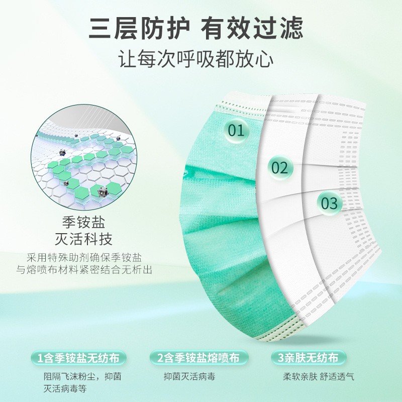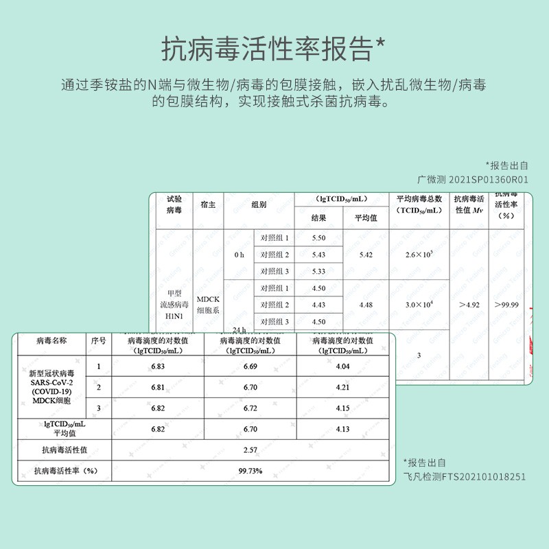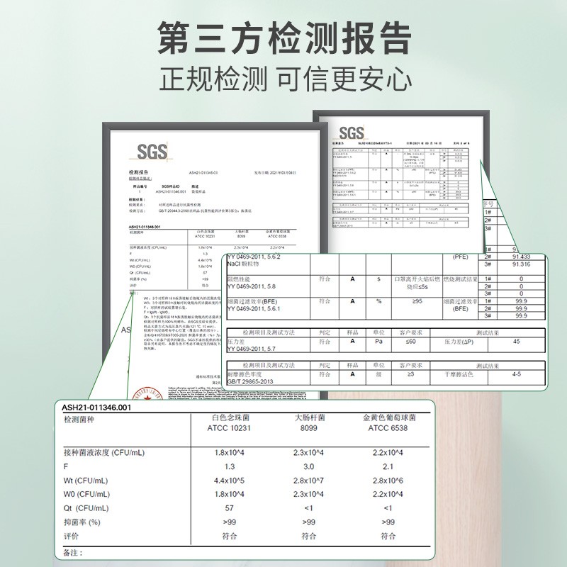 高效抑菌抗病毒,有效防止二次污染; 抗病毒活性率>99%,抑菌率>99%; 符合面部设计,佩戴舒适。